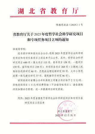 中南在线3月23日消息(通讯员 方艳丽 报道)近日,湖北省教育厅正式公布2025年度专项任务研究项目立项名单,武昌理工学院生命科学学院党总支书记胡瑞年主持申报的《民办高校党建与人才培养深度融合的实践路径及保障机制研究》(项目编号:25ZX018)成功获批立项。该项目聚焦民办高校党建工作与人才培养核心任务的融合发展,为学校党建工作创新与高素质人才培养提供了重要的科研支撑,也彰显了武昌理工学院在党建理论研究与实践探索方面的扎实成果。