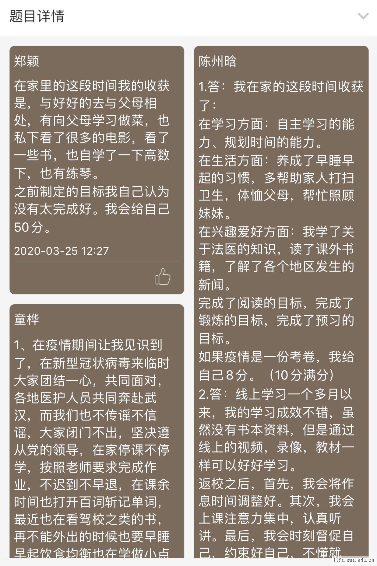 环境工程1801班的匡彬则着重从于自身角度,来讨论同学们该交出一份怎样的答卷——如何规划好疫情期间的学习与生活。匡彬认为,疫情期间,应强健体魄,培养自己的兴趣爱好,在学习上给自己定一个目标,在生活上要注意作息时间,在人际交往方面需要多和父母老师及朋友们沟通,在抗击疫情方面则是应当科学应对疫情。匡彬还提出了返校后要规划的事和要实现的目标,因疫情耽搁的学业不能落下。冬天失去的,春天夺回来,这是一份科学与理性的答卷。