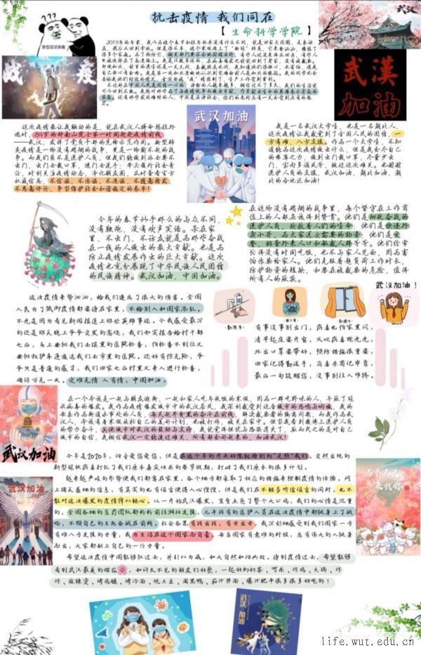 “想着最近疫情也挺严重的,看到网上有很多为一起为抵抗疫情加油的一些宣传,恰好学院也有抵抗疫情的征集令。我就迫不及待地制作海报,为武汉加油!”陈析激动地说。在她的手抄报中,最多的话就是“武汉加油”,最多的图就是“医护人员”的画。她希望用她的“话”、“画”两个元素为全民防疫战加油助威,也向奔赴在前线冒着生命危险的每一个医护人员表示诚挚的敬意。