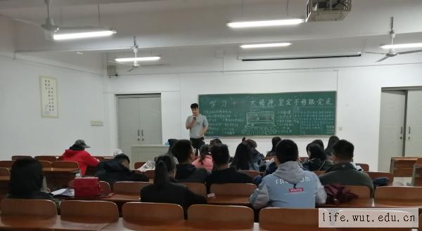 汪全首先向同学们介绍了十九大主要精神是什么,十九大主要精神包括坚持党对一切工作的领导、坚持以人民为中心、坚持全面深化改革、坚持新发展理念等等,并向同学们重点介绍了四个自信。四个自信的内容是:中国特色社会主义道路自信、理论自信、制度自信、文化自信。随后,汪全带领同学们一起唱了《我和我的祖国》,整个教室的氛围都被带动起来。此外,他还向同学们介绍了四个全面所包含的内容,最后汪全给了三分钟讨论时间,让同学们讨论一下作为当代大学生,如何遵循十九大精神,报效祖国。三分钟讨论完之后,很多同学都站起来分享了自己的想法,其中,王丛智同学表示:“要努力学好专业知识,积极参加党团活动,努力提高自己,争取早日成为一名共产党员,为将来祖国的奋斗事业打下坚实基础。”他的发言赢得了阵阵掌声。