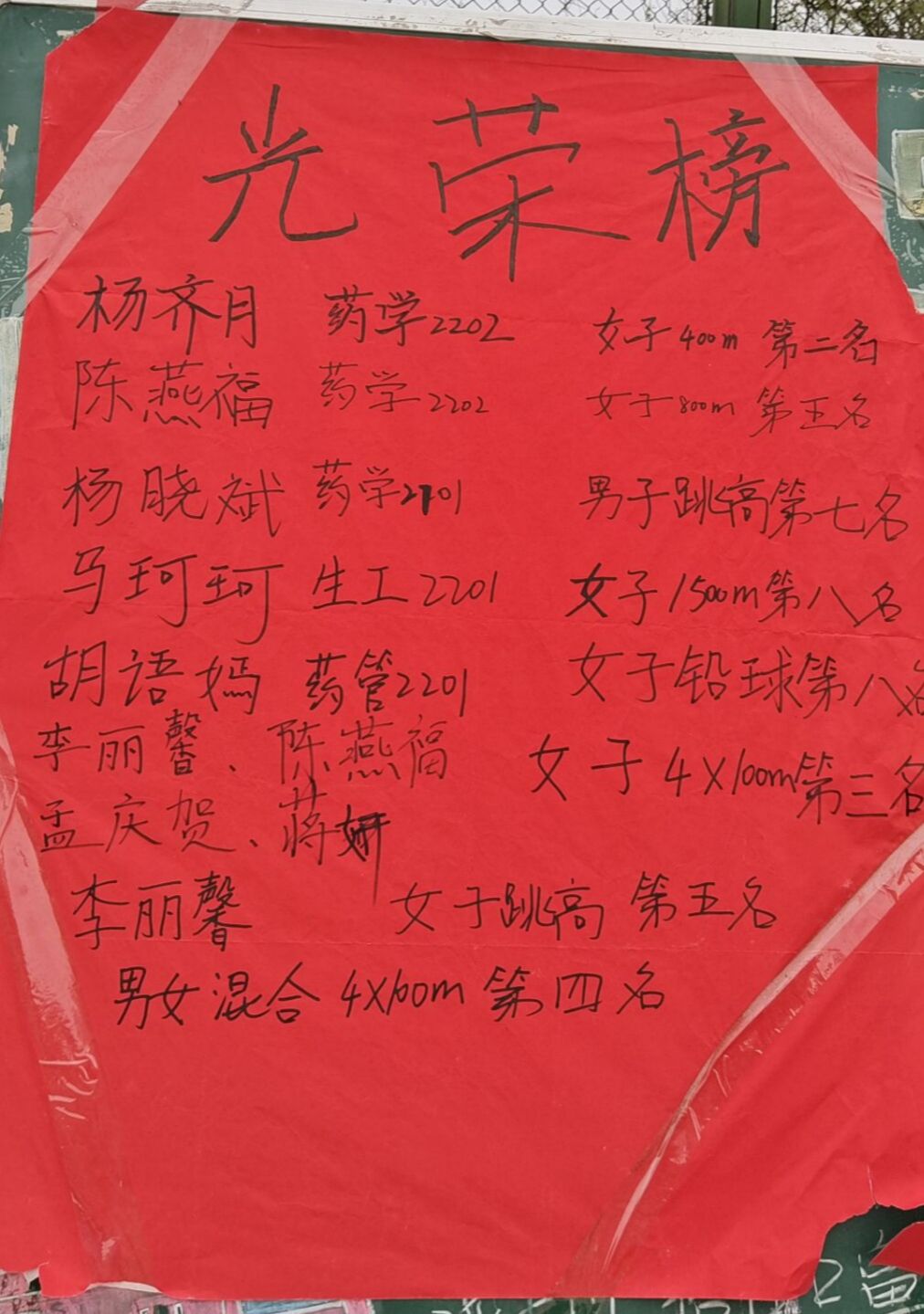 据了解,生命科学学院运动员们在此次运动会上表现优异。其中,杨齐月获得女子400米第二名,李丽馨、陈燕福、孟庆贺、蒋妍获得女子4*100米第三名,陈燕福获得女子800米第五名,马珂珂获得女子1500米第八名。其中来自生命科学学院生物工程2201班的马珂珂在采访中说道:“无论是运动会前期的训练还是比赛时的奋勇争先,都是无比困难和艰苦的。但当我真正站在了跑道上,听见生命科学学院的同学们为我呐喊,感受到风的声音从我的耳畔划过,我觉得我的付出和努力值得。我很喜欢一句话,自信人生二百年,会当水击三千里,让以微笑面对困难,用自信挑战生活,虽然有自信不一定会赢,但失去了自信就一定会输。相信自己,别说你不行。”
