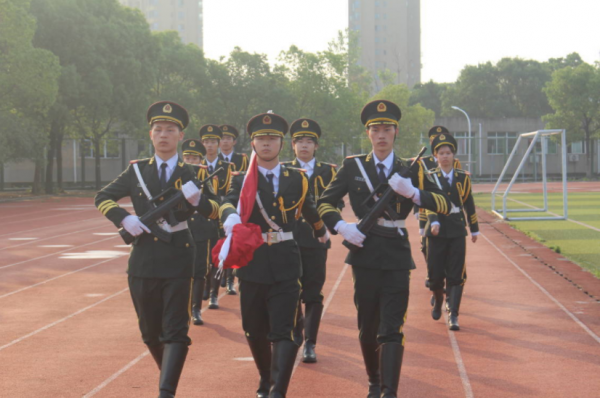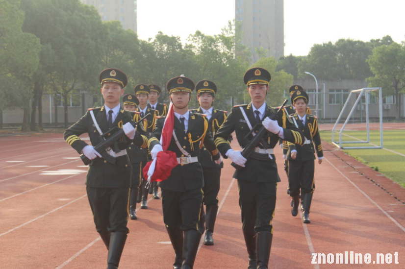 升旗仪式于上午7时准时开始。伴随着《义勇军进行曲》的响起,国旗队的队员们迈着整齐划一的步伐走向旗杆,他们踏步的动作一致,脸上的表情严峻庄重。破晓时分,鲜艳的红旗、闪光的五角星,在雄伟的国歌声中,几百双眼睛仰望着冉冉升起的国旗,行着庄严的注目礼,鲜艳的五星红旗迎风飘扬。