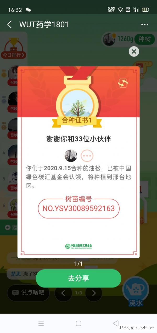 据了解,学院每年都会组织同学们去种树。今年由于疫情原因,无法实地种树,药学1801班文艺委员彭澳便组织同学们一起在蚂蚁森林同学林里“云种树”,同学们都很踊跃加入同学林里浇能量,还在QQ群中讨论出要种的树种。彭澳还总结每个树种需要每天浇的能量,激励同学们在学校多跑步,锻炼身体,用步数换绿色能量浇成班级大树。很多同学说:“这个同学林也是见证我们大学时光的友谊树”。当问及为什么要种这棵树的时候,该班班长魏磊说:“我们的树名是WUT药学1801,我们已经种下一棵油松了,希望以后种下更多的树,为沙漠增添一点绿。而且每个人都会有个绿色证书,这就是我们共同努力的回忆。”