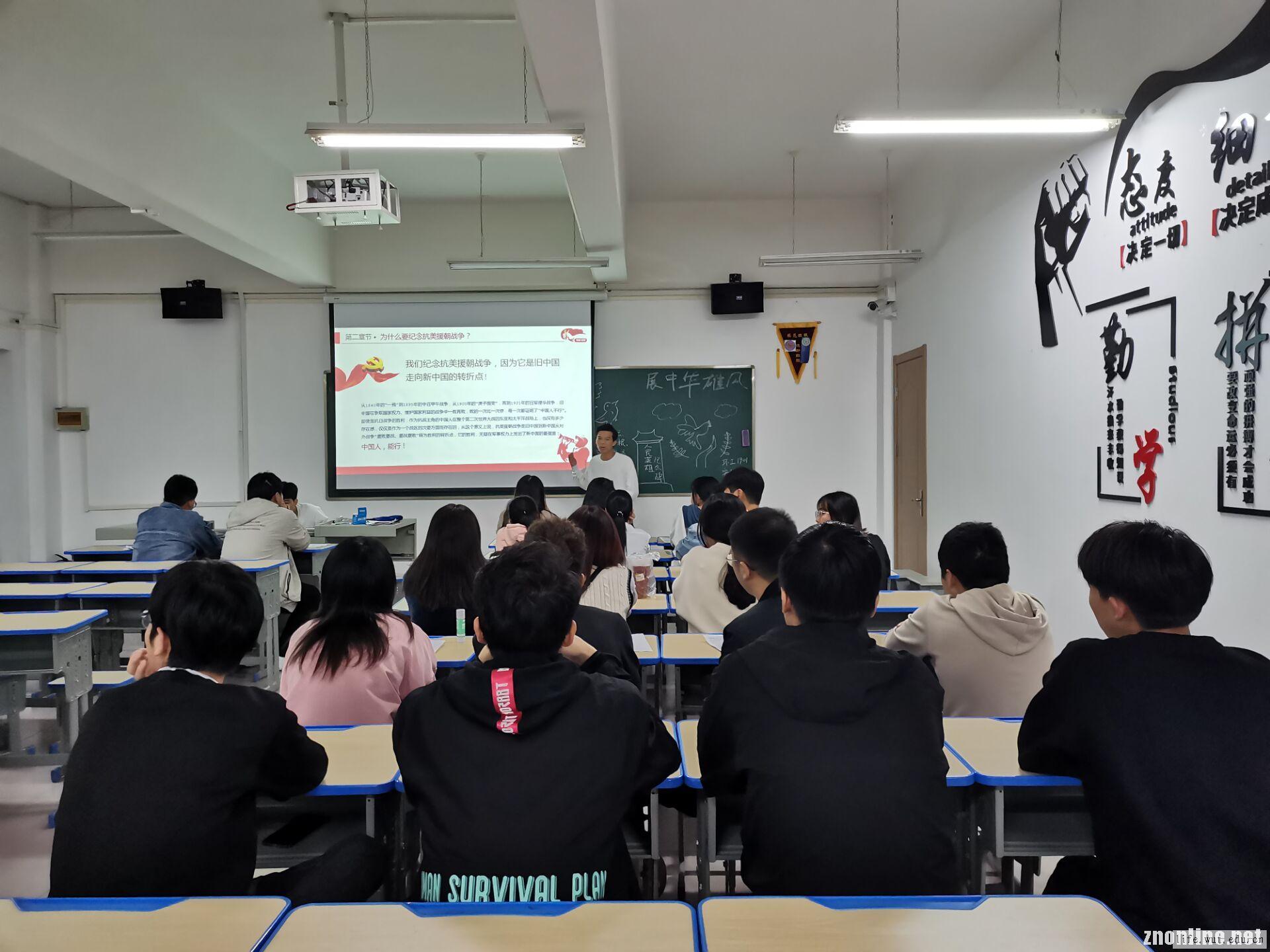 据悉,每个班级的同学为了纪念此次战役,特意的去准备了许多的相关历史资料。生物制药2001班主讲人赵英海向大家提出了两个问题:中国为何要抗美援朝、为什么要致敬各位英雄们,主讲人在班会的开始用了二个问题开头,这让每一位同学都踊跃的思考了起来,接着,在接下来所放的视频中正式的回答了这个问题也同时让同学们深刻的明白了:国家安危乃是个人安危,和平之宝贵都将功亏于无数的英雄。当问到心得体会时王博涵同学说道:“我懂得了中国人民志愿军不畏强敌的精神、永不言弃的精神,在装备差距悬殊,在火力无法匹敌的情况下,创造了奇迹与神话。中国军人展现了钢铁般的毅力,中国军人打灭了西方国家嚣张的气焰,让他们也产生了畏惧”。