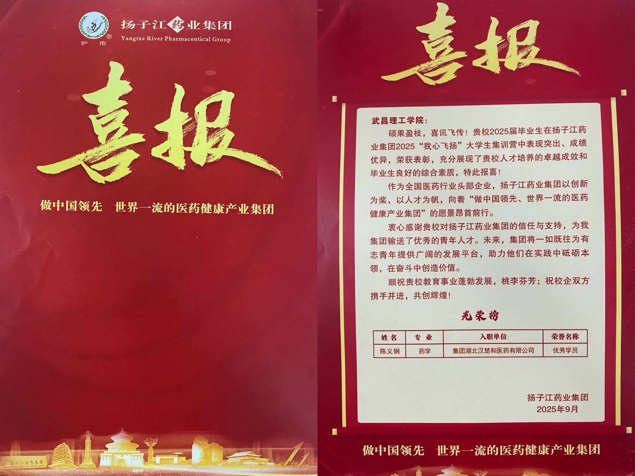 中南在线10月10日消息(通讯员 饶梦婷 报道)金秋送爽,硕果盈枝。近日,武昌理工学院收到来自扬子江药业集团的喜报,热烈祝贺我校生命科学学院药学专业2025届毕业生陈义钢同学,在扬子江药业集团举办的2025“我心飞扬”大学生集训营中表现卓越,荣获“优秀学员”称号。这一荣誉不仅是对陈义钢同学个人能力和综合素质的高度认可,更是武昌理工学院长期以来坚持立德树人、注重人才培养质量结出的又一硕果。